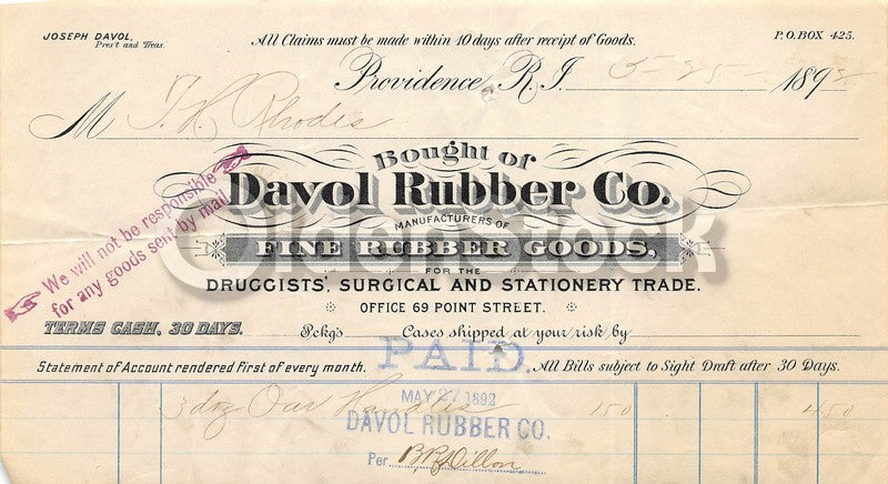 Davol Rubber Medical Supply Providence Rhode Island Antique Advertising Letter 1892