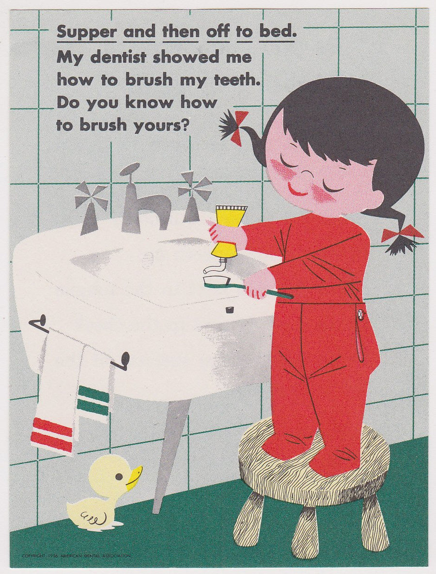 How to Brush Your Teeth Little Girl in Pajamas Vintage Dentist Office PSA Advertising