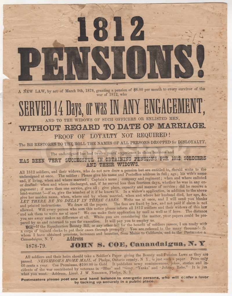 War of 1812 Military Soldiers Pensions Antique Legal Advertising Broadside 1878