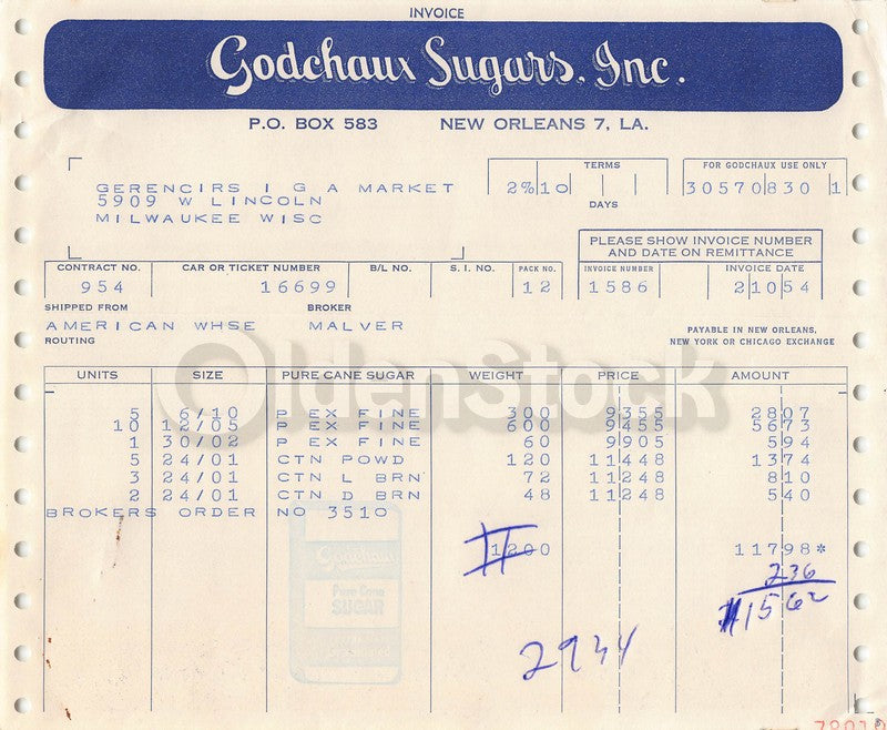 Godchaux Sugars New Orleans LA Vintage Advertising Sales Invoice 1954