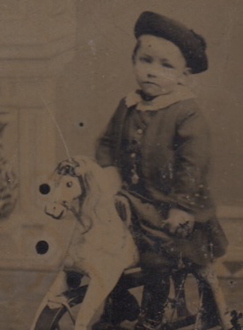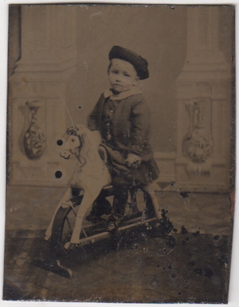 Cute Little Boy on Folk Art Hobby Horse Antique Tintype Photo