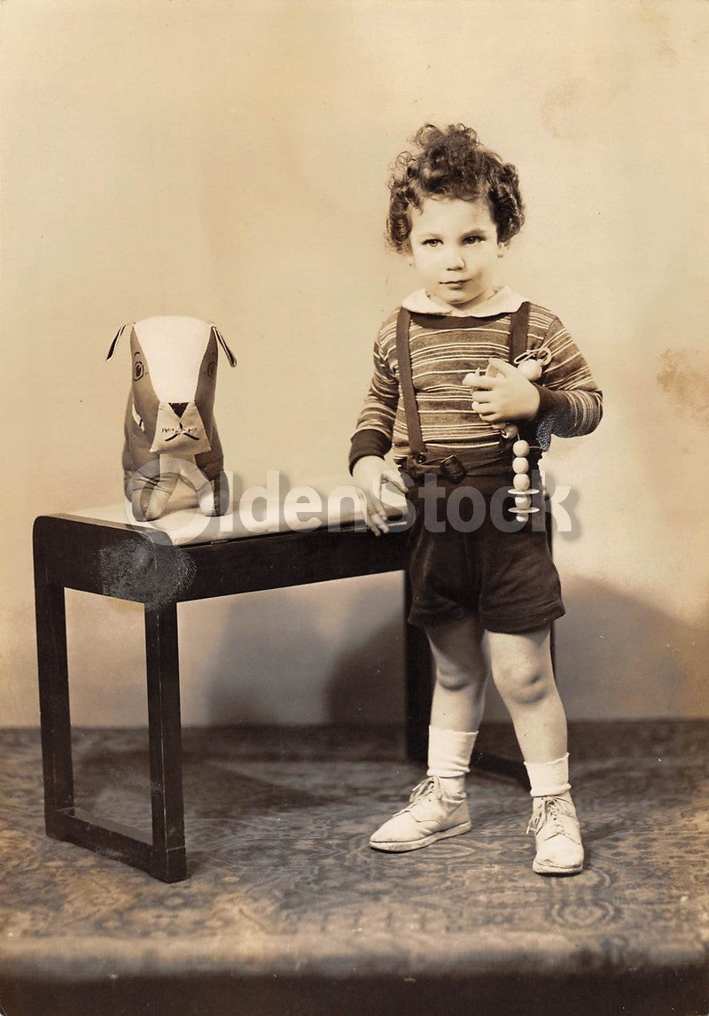 Darling Curly Hair Little Boy with Toy Doggie Vintage Family Snapshot Photo