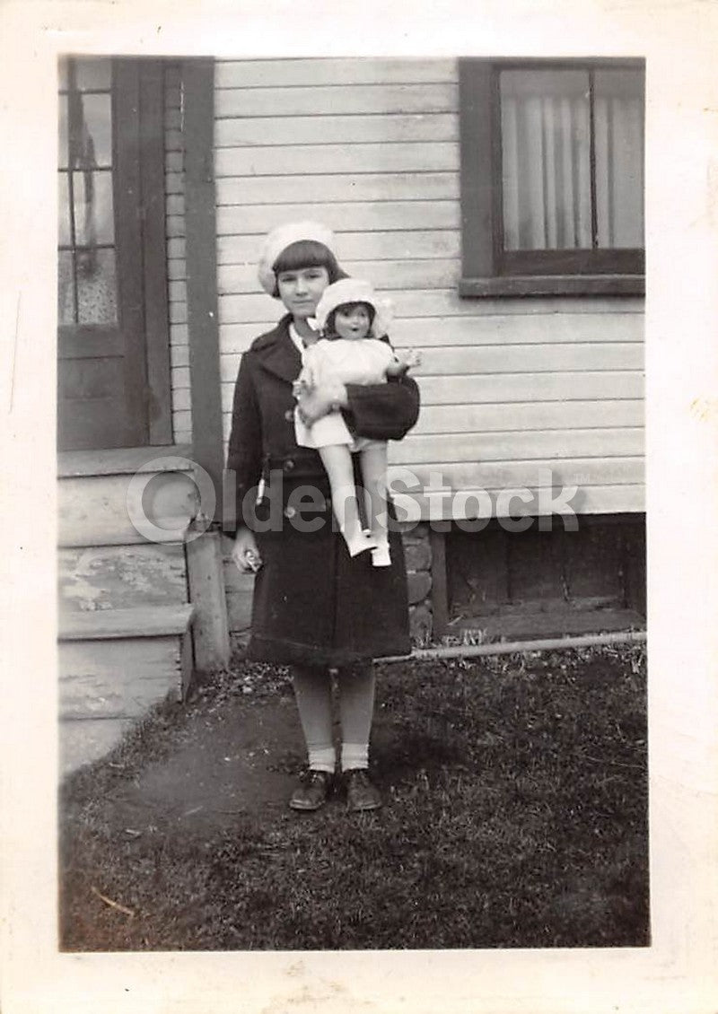 Cute Little Girl and Her Toy Doll Out Front Vintage 1940s Snapshot Photo