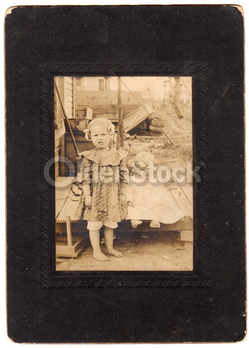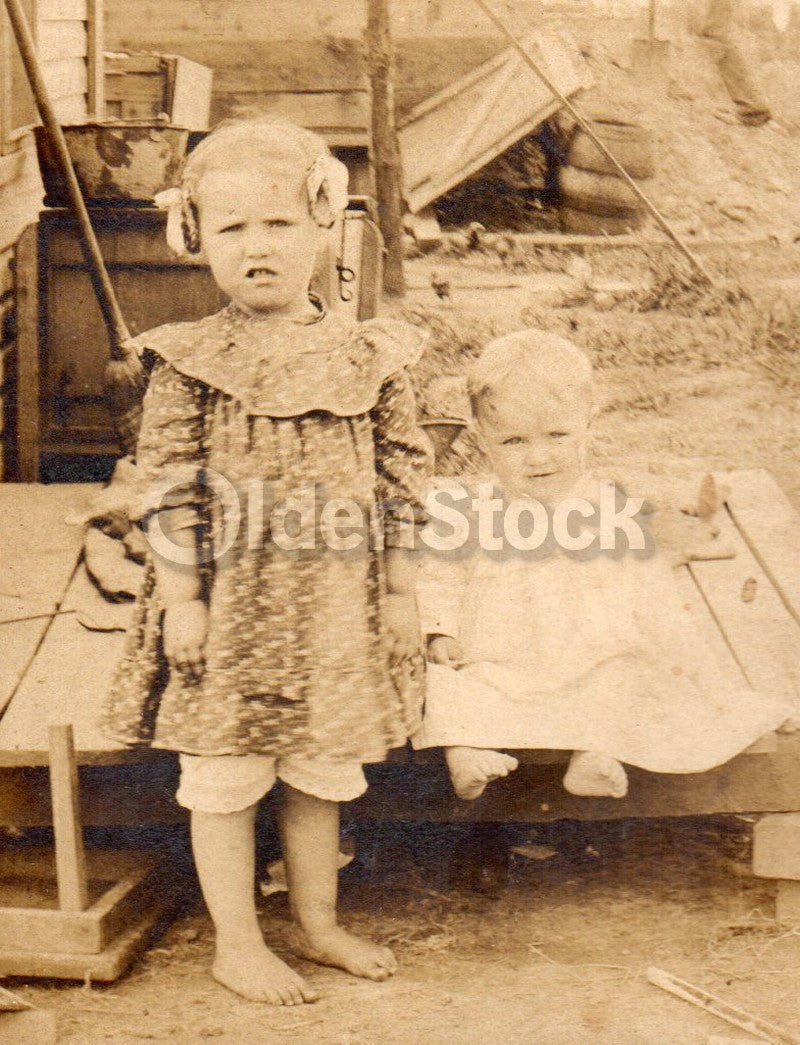 Montoya Girls Darling Kids Playing in Dirt at Home Antique Snapshot Photo on Board