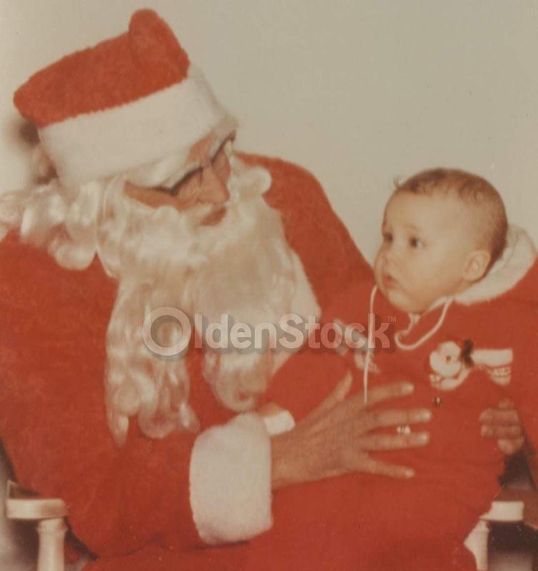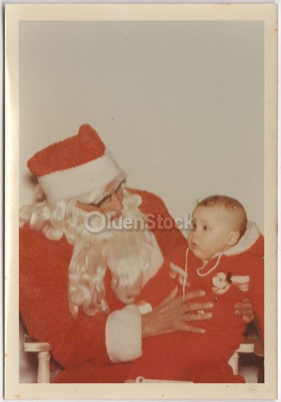 Cute Baby in Christmas Jumper Sits on Santa's Lap Vintage Americana Snapshot Photo