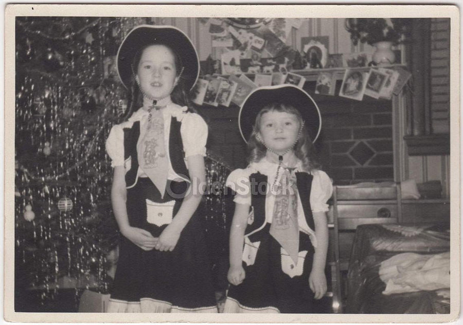 Cute Little Cowgirls on Christmas Morning Vintage Americana Snapshot Photograph