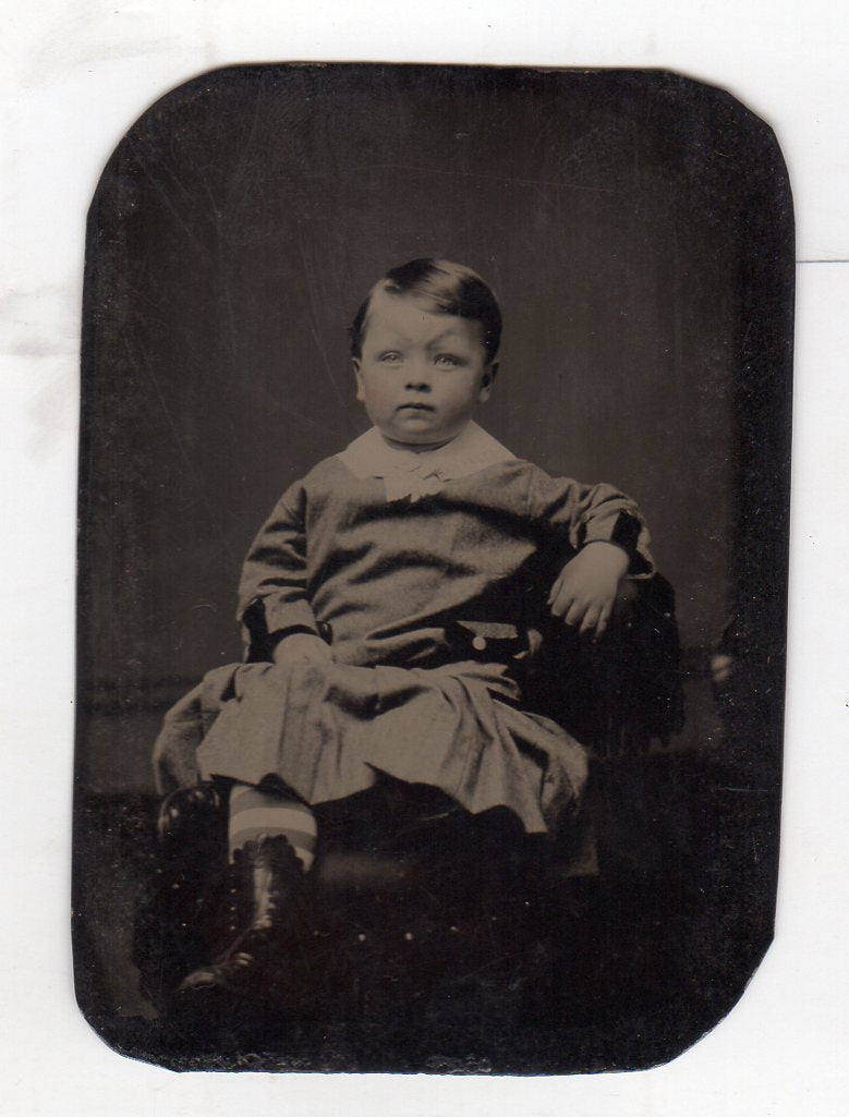 Cute Little Boy with Crazy Eyebrows & Fun Socks Antique Tintype Photograph