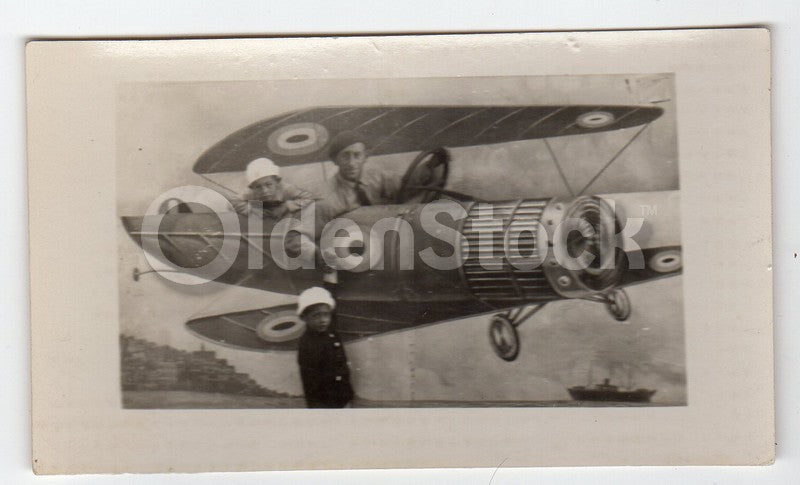 French Carnival Fun Dad & Kids Fighter Plane Antique Snapshot Photo