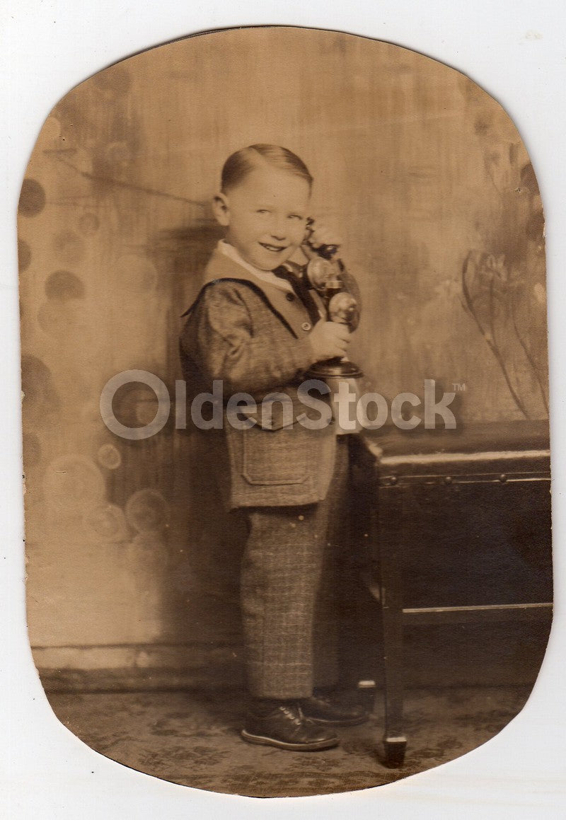 Dapper Little Boy in a Suit Playing on the Telephone Antique Snapshot Photo