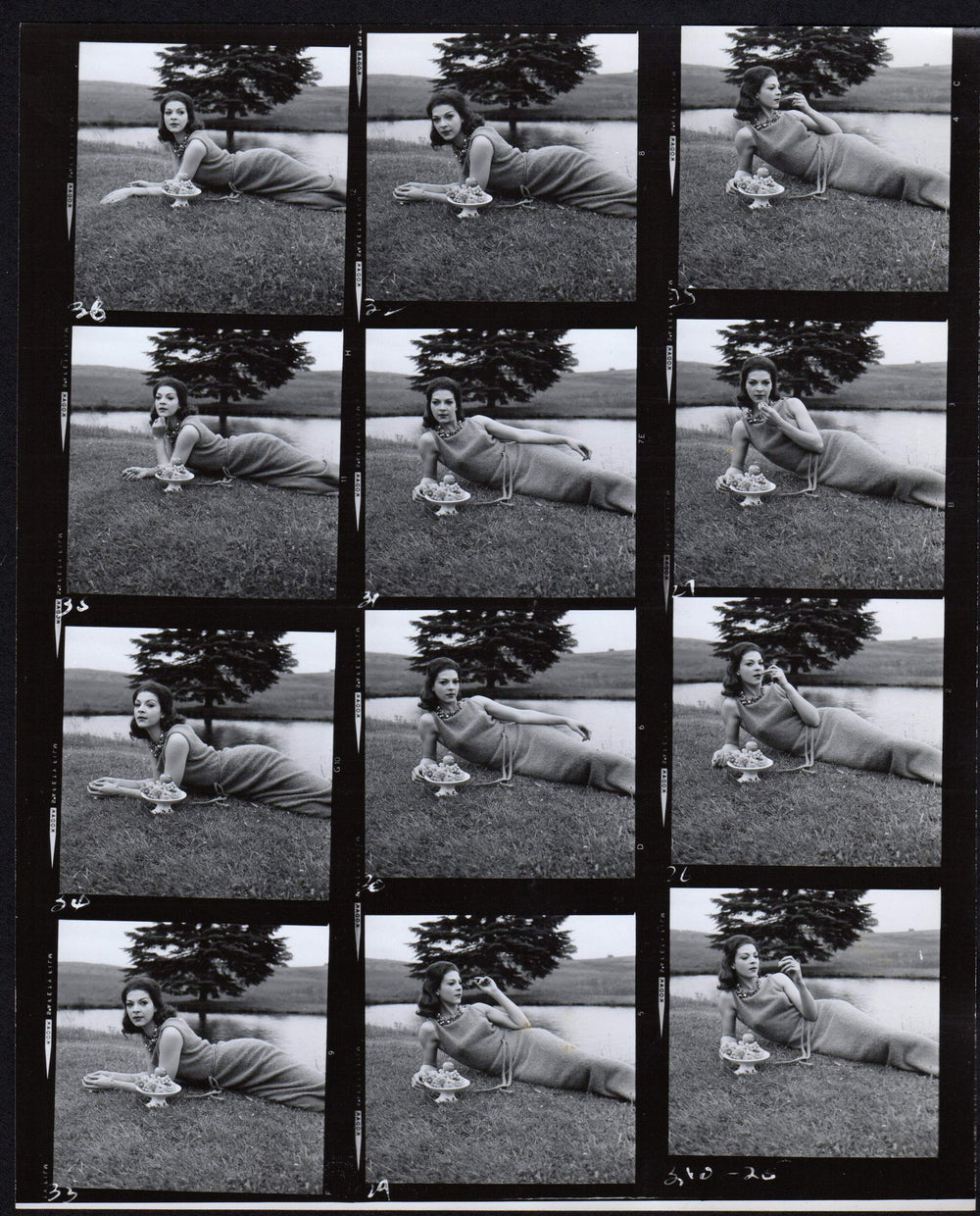 Lovely Brunette Fashion Model Eating Grapes on the Lawn 1960s Photo Contact Sheet