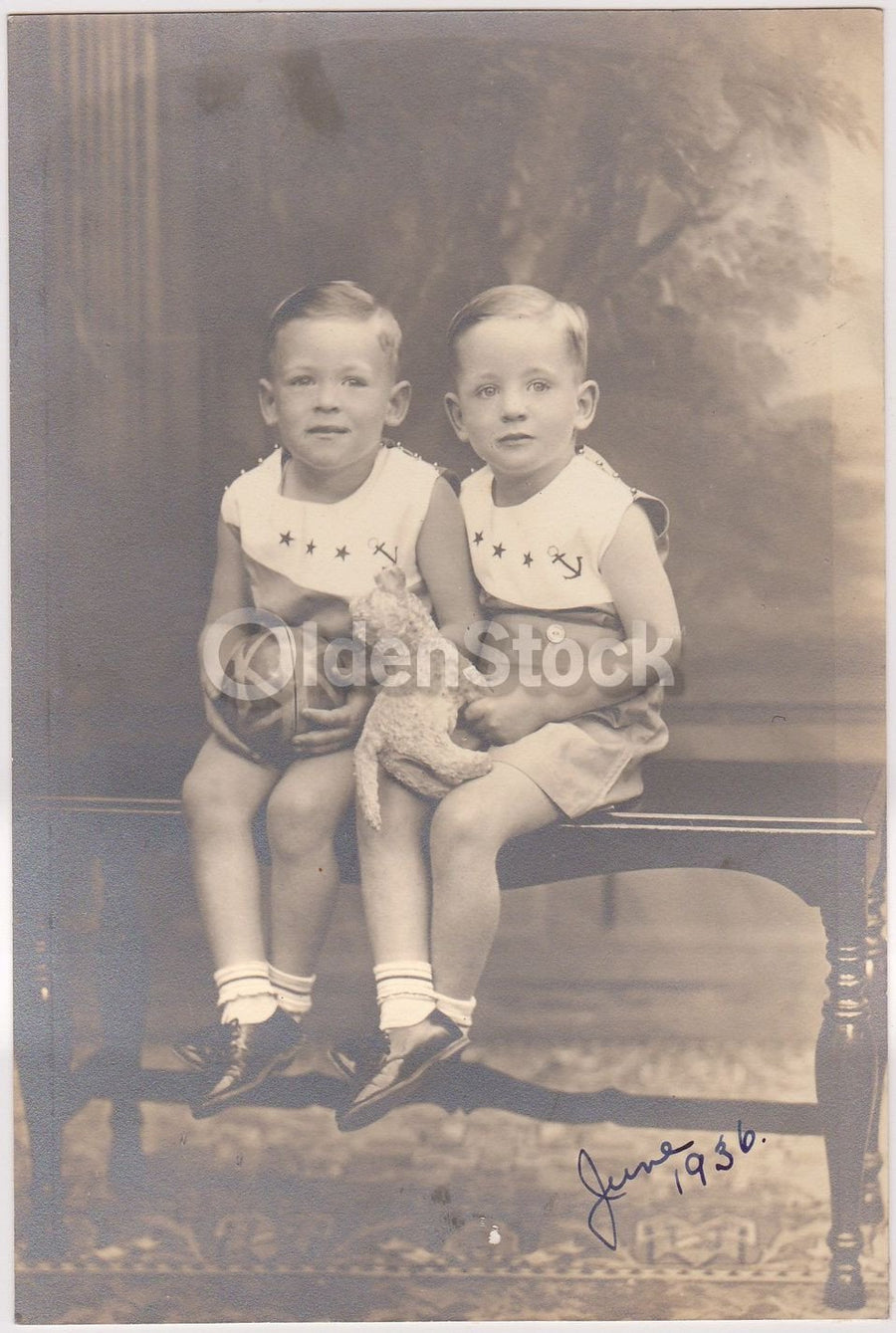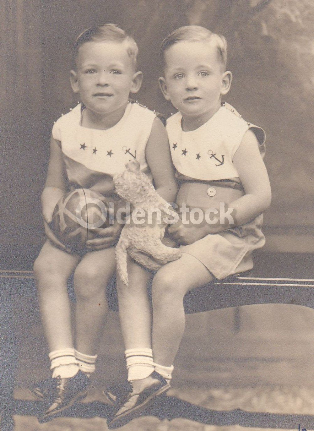 Twin Boys in Sailor Outfits Stuffed Animal Toy Ball Vintage Snapshot Photograph