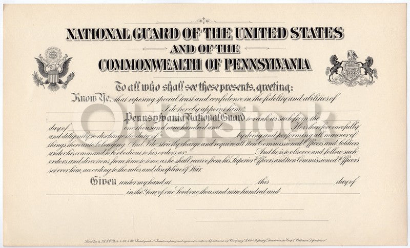 Pennsylvania National Guard Unused State Seal Promotion Certificate 1930s
