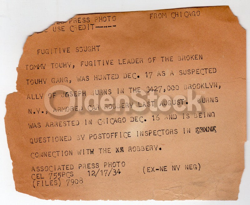 Tommy Touhy Gang Irish Mafia Armored Car Robbery Vintage News Press Photo 1934