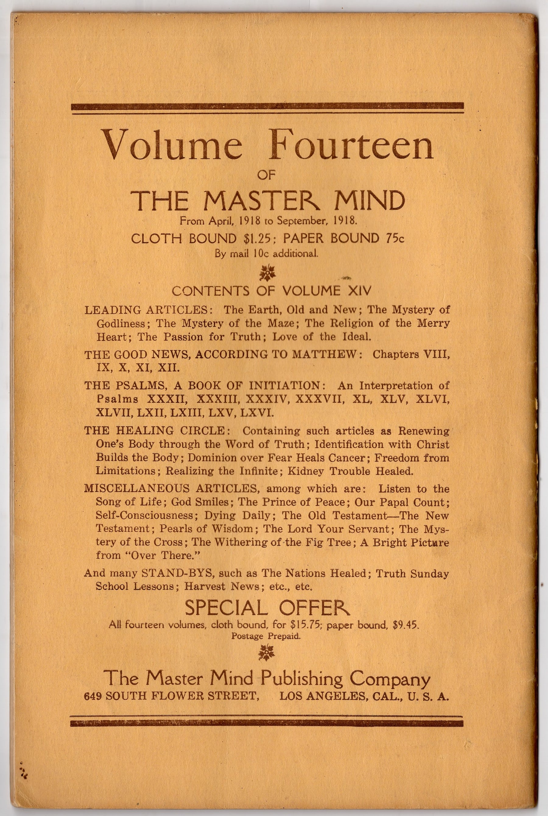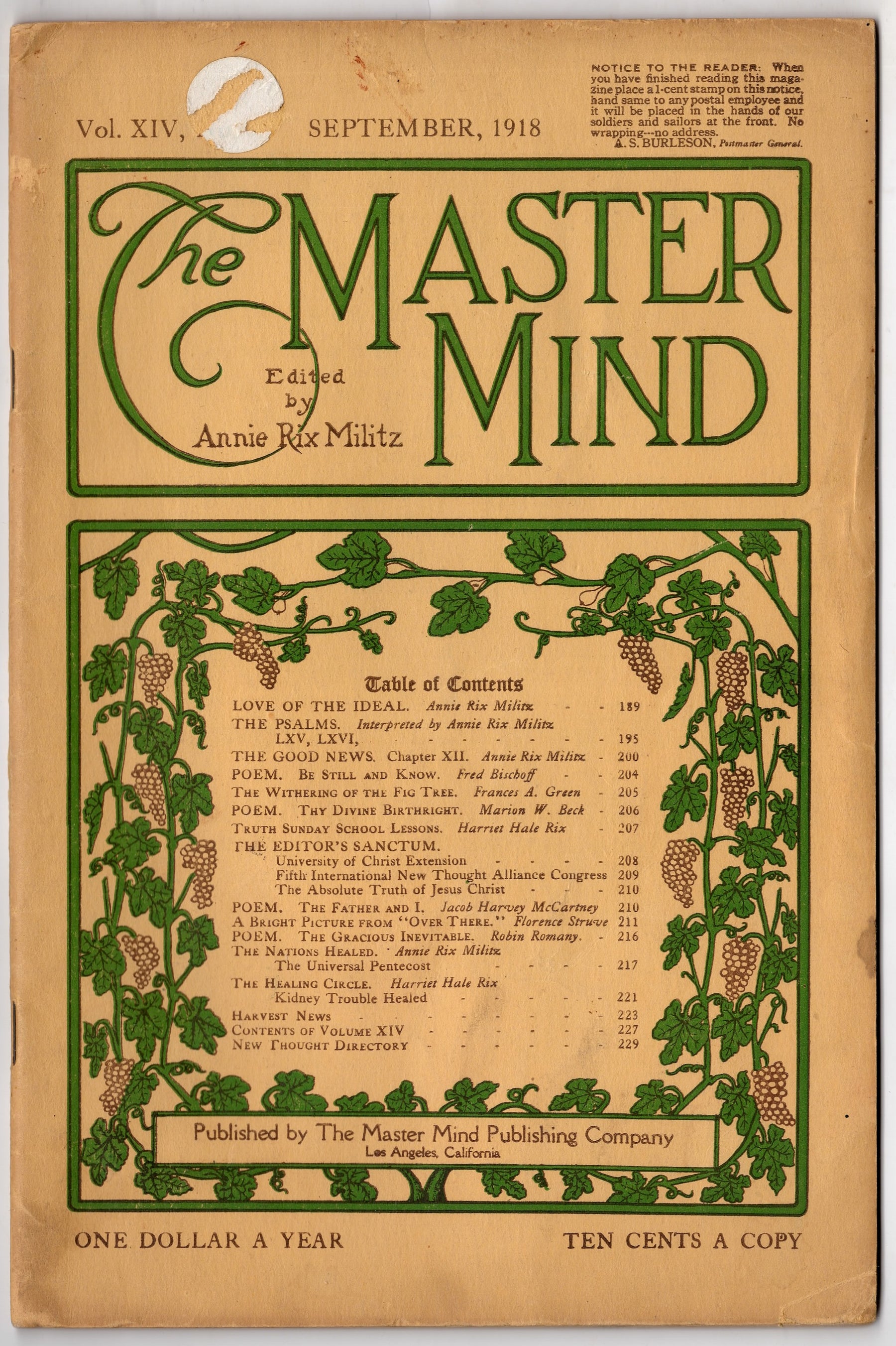 The Master Mind, a seminal metaphysical and religious magazine edited and published by Annie Rix Militz, a leading figure in the early 20th-century New Thought Movement.