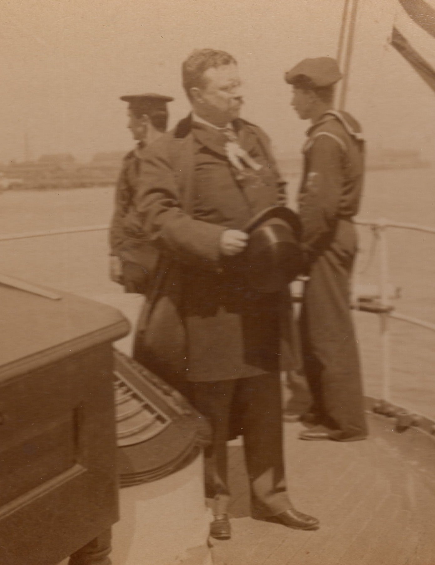 The photograph captures President Roosevelt in a candid moment aboard the U.S. Revenue Cutter Algonquin. He is seen in formal attire, holding his top hat while conversing near a group of sailors in period naval uniforms. This visit to Charleston in April 1902 was a major diplomatic and domestic event, intended to promote reconciliation and commercial ties between the North and South while highlighting the burgeoning American naval presence. Roosevelt's appearance at the Charleston Exposition was one of his earliest major tours as President, following the assassination of William McKinley. The stereoview serves as a superb example of early 20th-century photojournalism, offering a three-dimensional glimpse into the robust public persona of the "Rough Rider" president at the height of his influence.