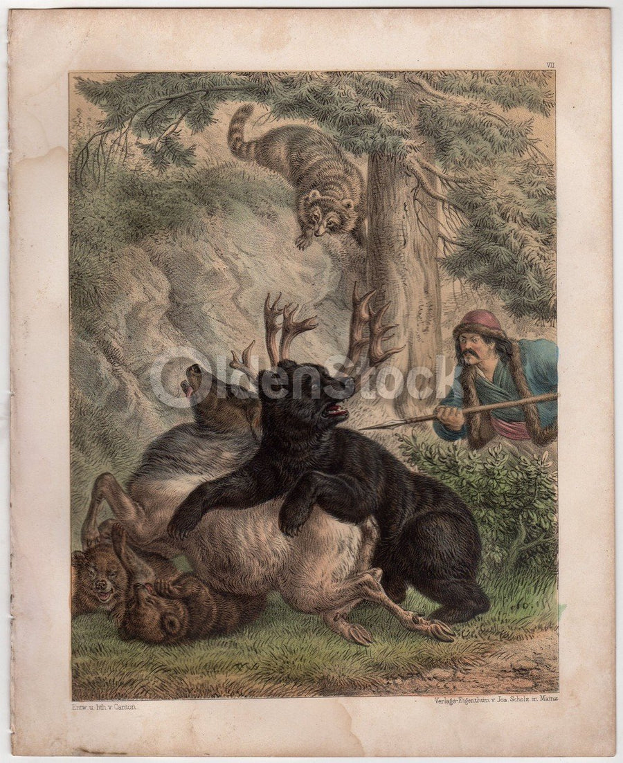 Wild Bear Hunter Hunting Deer Nature Scene Antique Graphic Art Engraving Print 1863