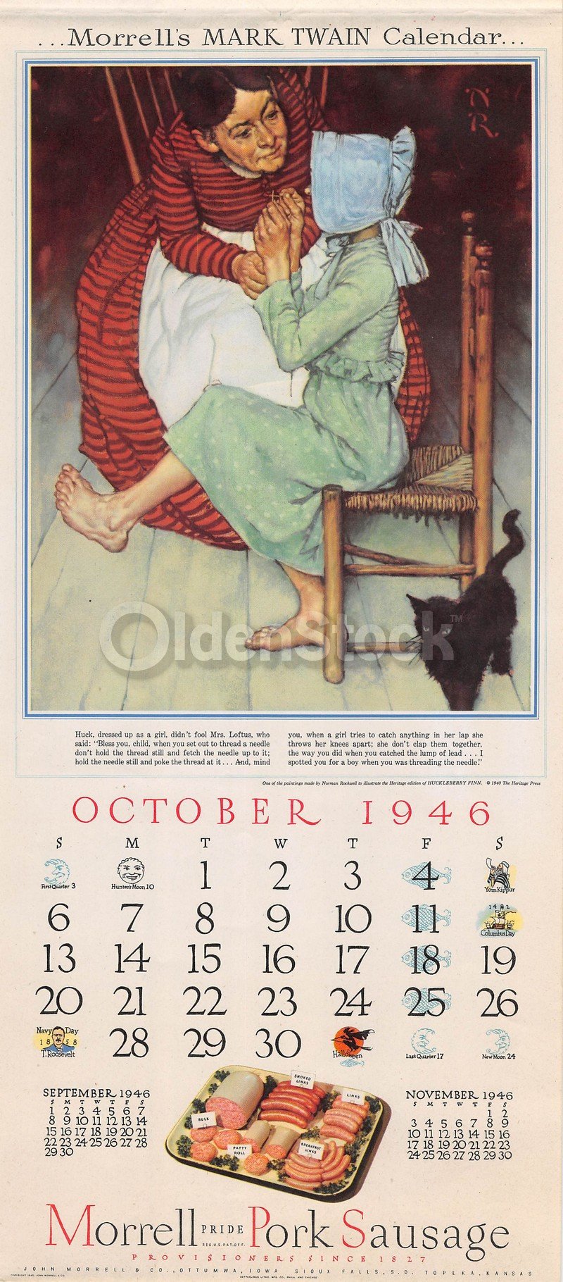 Huck Finn & Jim Vintage Norman Rockwell Art Morrell Donuts Calendar Poster 1946
