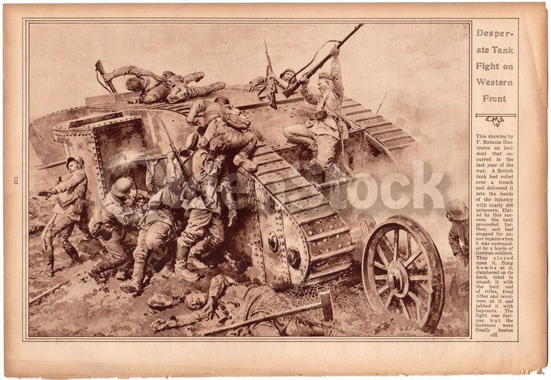 German Tank Fight by Illustrator F. Matania Vintage News Photo Poster Print 1921