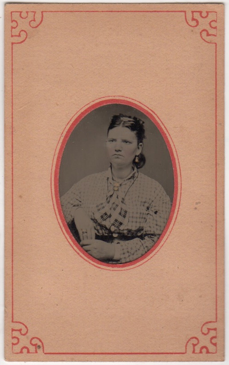Young Woman in Plaid Trim Dress and Fancy Hat Crisp Antique Tintype Photo