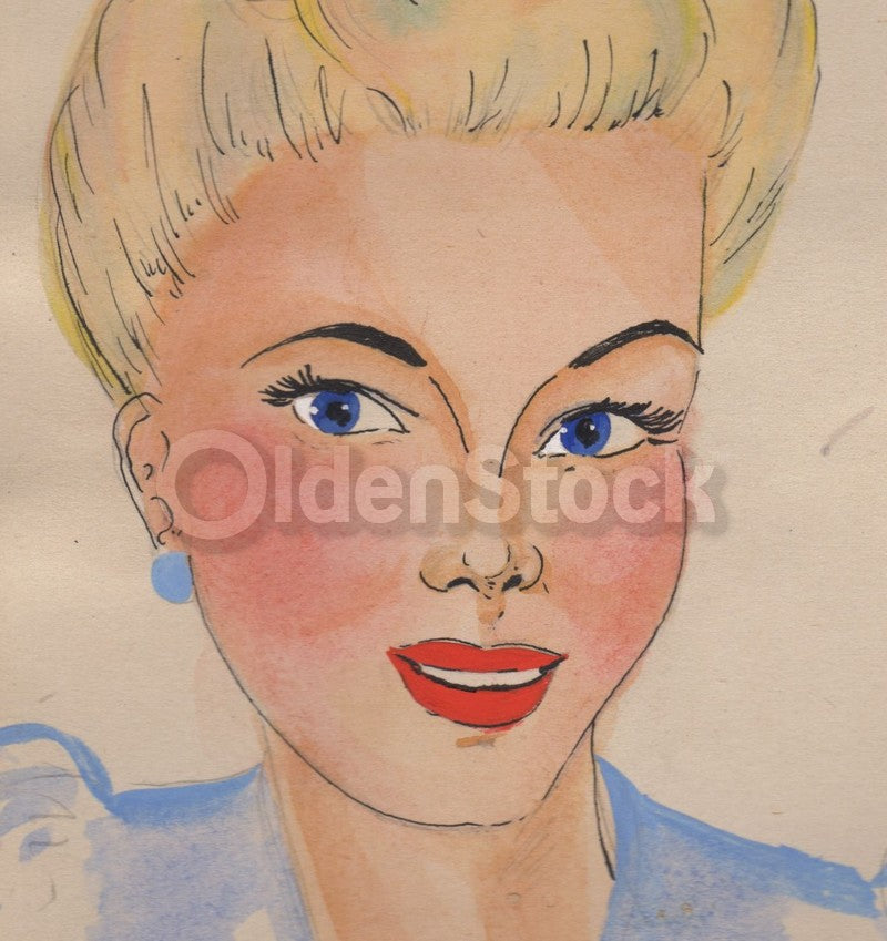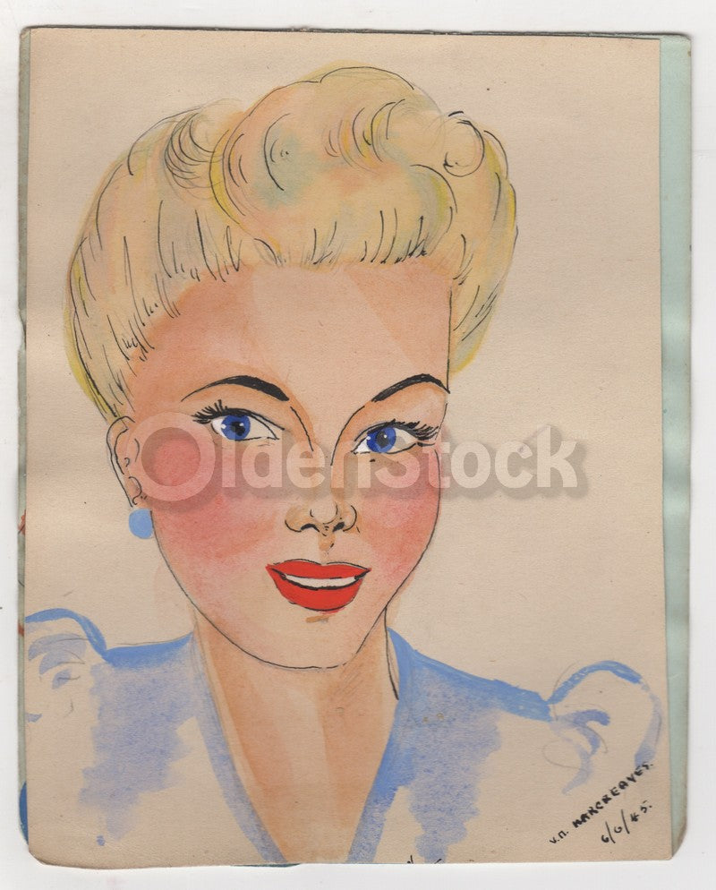 Striking Blonde Woman Blue Eyes Original Vintage Watercolor Painting, Signed