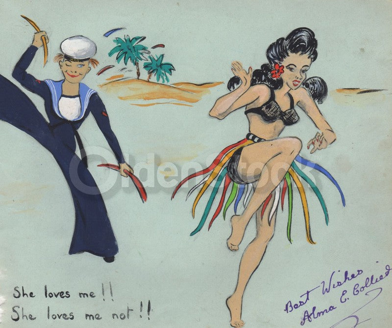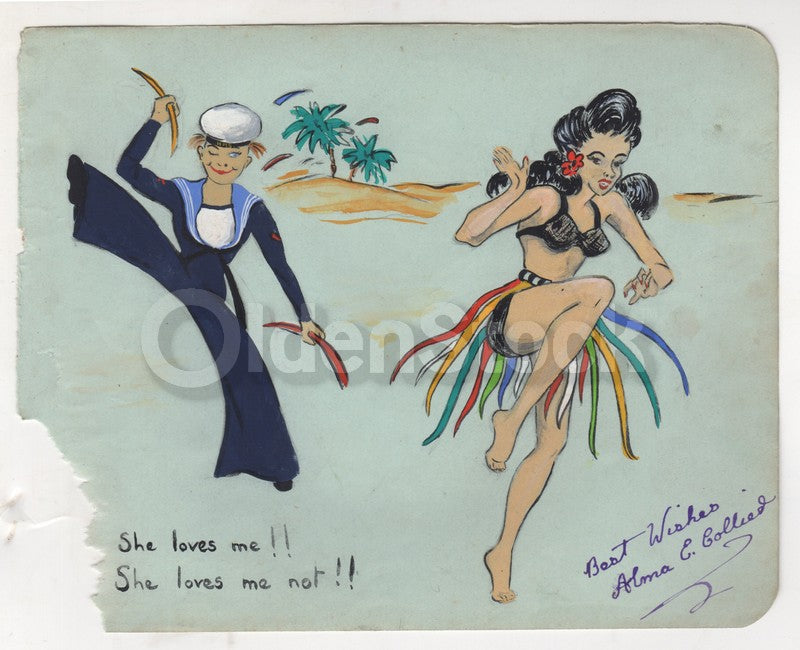 WWII Homefront Sailor Boy Island Girl Humor Original Watercolor Painting, Signed
