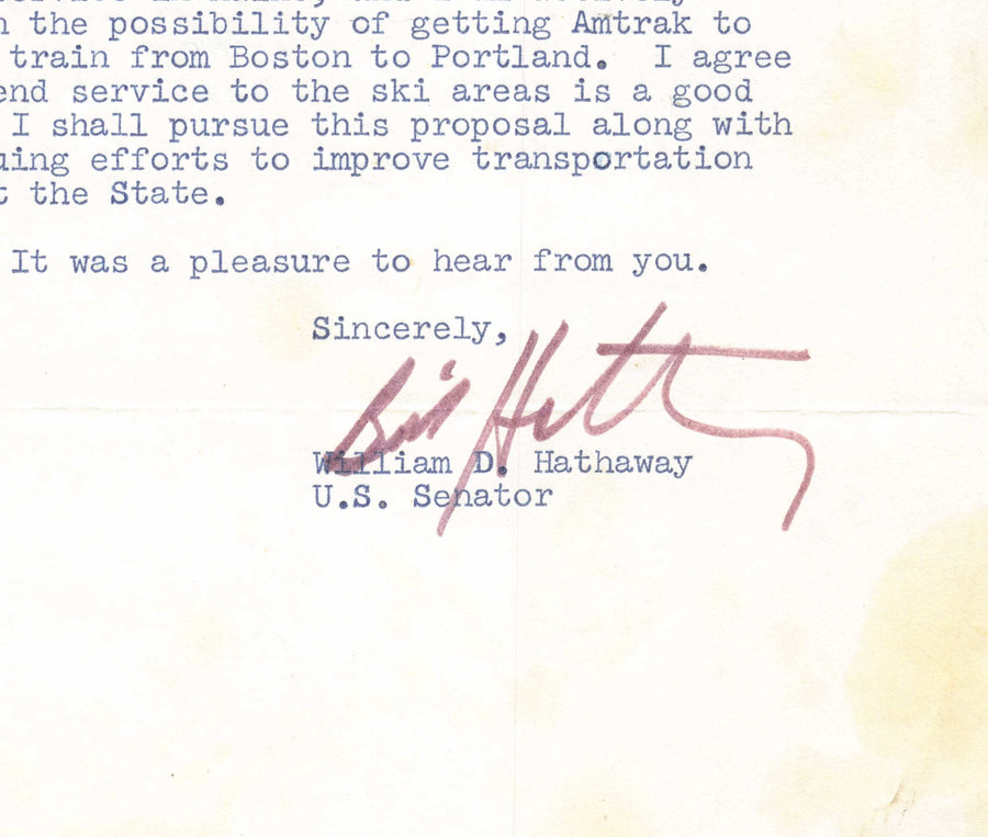 Bill Hathaway Maine Senator Autograph Signed Train to Boston Letter 1974