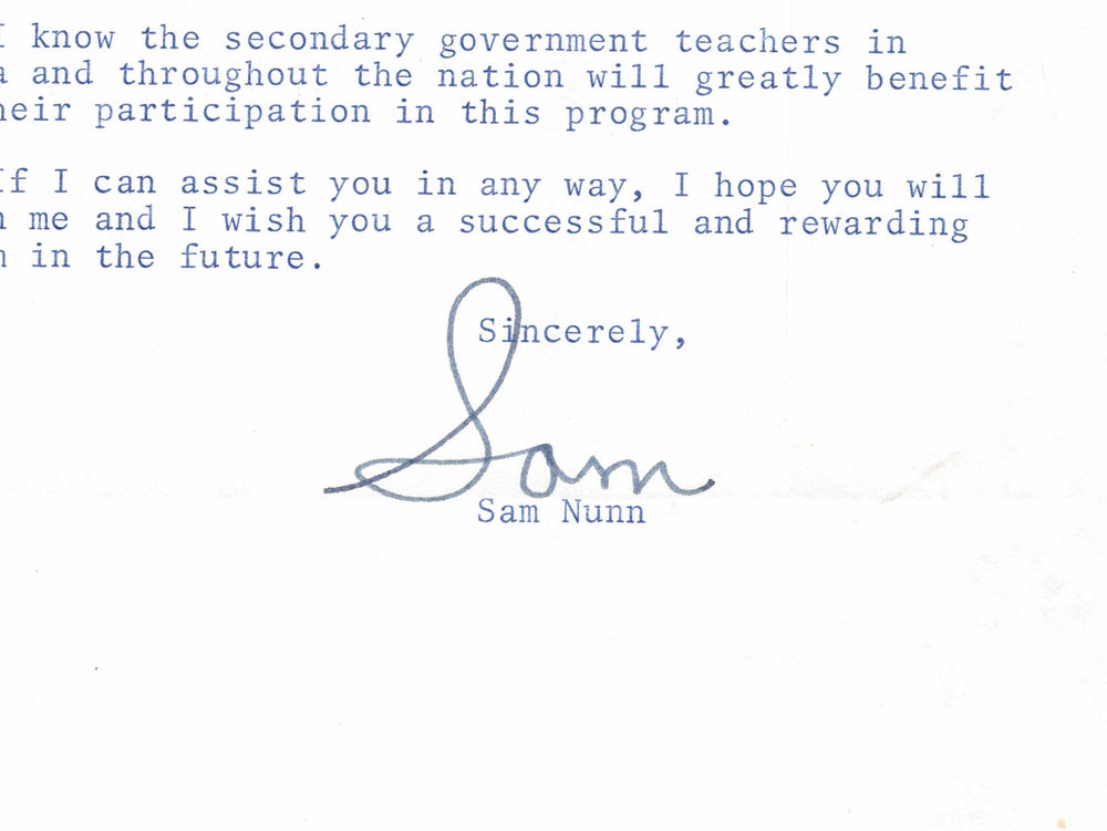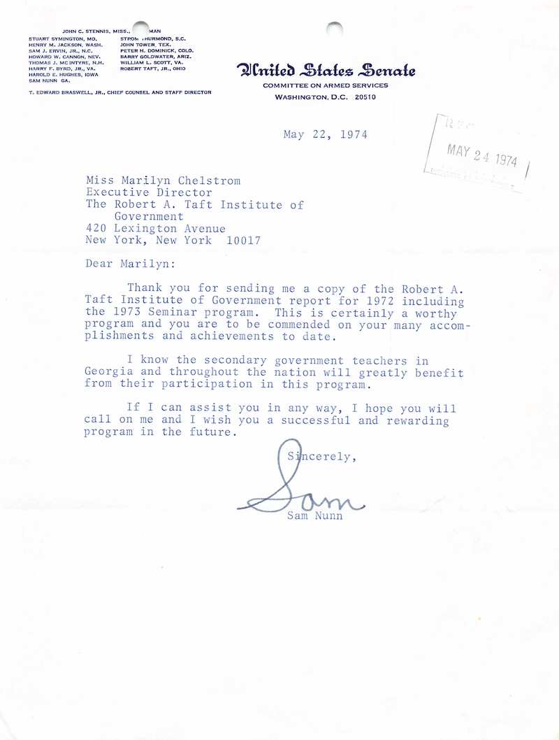 Sam Nunn Georgia Senator Autograph Signed Robert Taft Institute Letter 1974