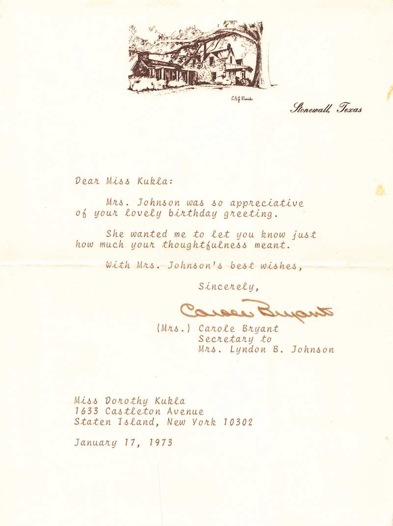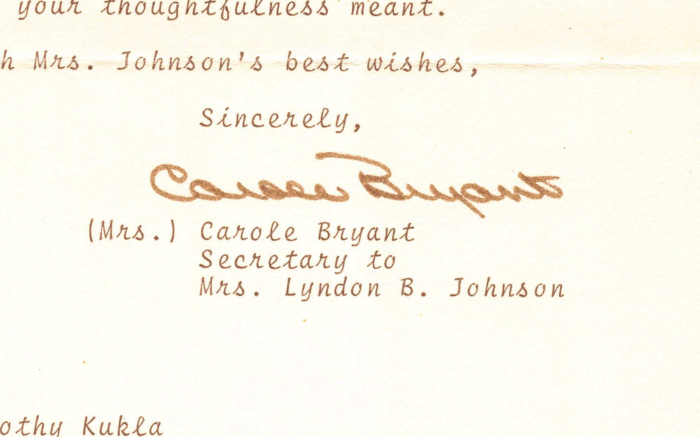 Carole Bryant 1st Lady Bird Johnson Secretary Autograph Signed Texas Letter 1973