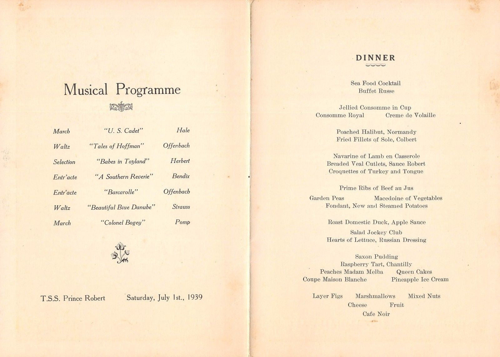 ANTIQUE MUSICAL PROGRAM DINNER MENU 1939