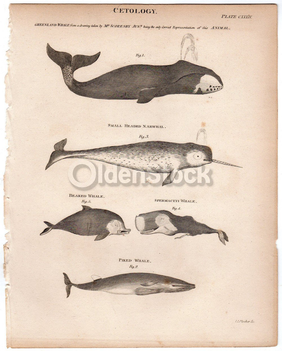 Sperm Whale Beaked Whale Narwhal Zoology Art Antique Engraving Print Bookplate