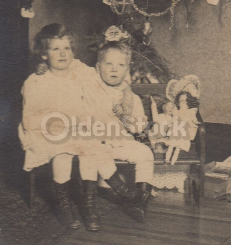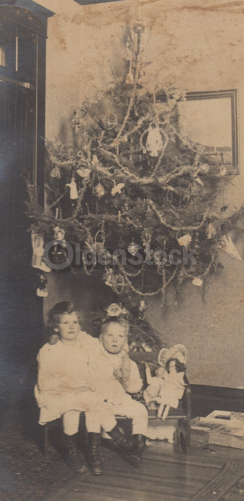 with their doll toys under the wonderfully decorated Christmas tree